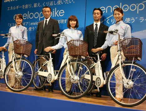 Sanyo today unveiled an electric hybrid bicycle called the Eneloop Bike, which is based on their impressive Eneloop battery technology. The bike has a cruising range of 100km (62 miles) in auto mode which is similar to Panasonic’s regenerative electric bike and uses a unique two-wheel drive system for greater stability.