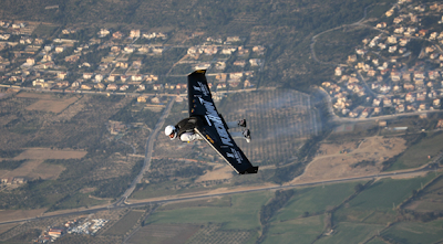 Rossy’s wing is a one piece design with no flaps or slats to control direction or lift. He relies on head movements and the shifting of his weight alone to steer towards the desired direction (see him in action in the video below).