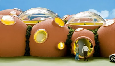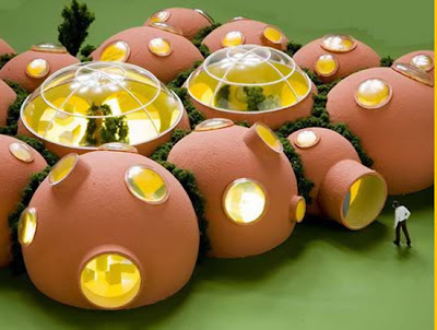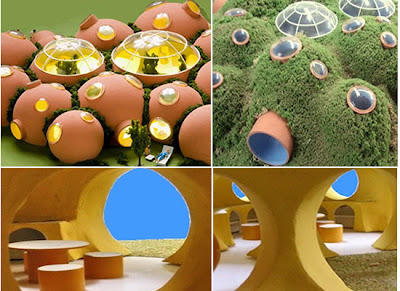 The Bubble Building is made from concrete insulate which can be covered in shrubbery to style a more natural look. The windows and doors are made from insulating glass and the giant domes are supposedly able to reflect heat.