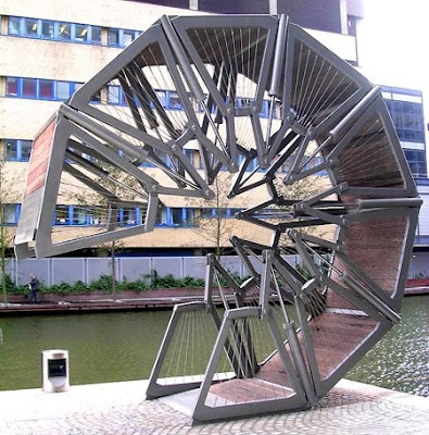 The genious Rolling Bridge is an award-winning design by Thomas Heatherwick, installed over the Grand Union Canal in London. It looks like a regular canal footbridge whilst horizontal, but curls up like a grub when boats need to pass.