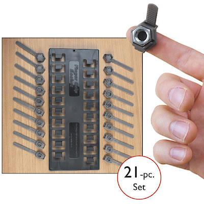 The set includes 10 US sizes from 3/16″ up to 9/16″ and 10 metric sizes from 6mm to 15mm. The grips are made of plastic and are not very deep, so they’re only for starting a thread, not for tightening. If you’re interested, they’re available from Whatever Works and Amazon.com for $20.