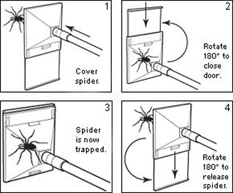 As outlined in the illustration below, using the device is quite a snap. You place the transparent housing over the insect you wish to trap and rotate the handle 180 degrees to close the door. Once outside, you do a reverse 180 to release the bug.