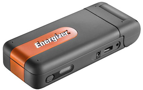 The Solar Battery Charger seems to have been inspired by clam-shell-style cellphones, only ruggedized to match its weatherproof design. It can be juiced-up via an AC wall socket (if you’re near one) on those dreary, sunless days and Energizer have generously included the two rechargeable batteries. It looks as though it also includes a flash light on the hinge (below), though that is unconfirmed.