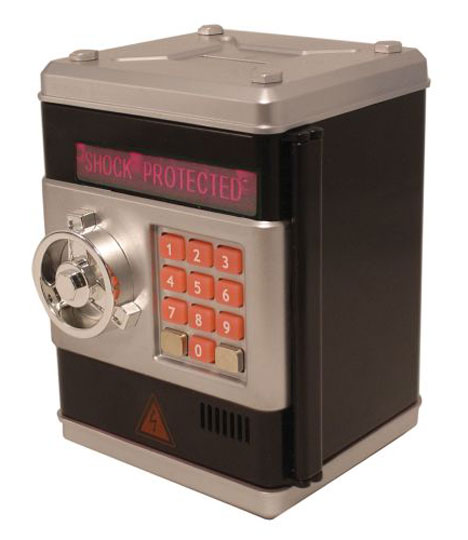 You can program the electro-money-box with your own 4-digit code and it comes complete with a coin slot and collection tray for your hard-earned change. Flashing lights and sound effects are included too, so you can race back to your cubicle to catch the would-be-thief red numb-handed.