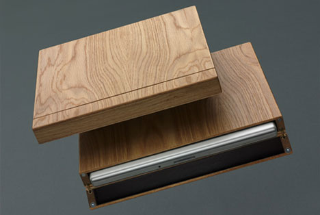 Perhaps inspired by the magnetic latch feature on MacBooks, the cases incorporate a magnetic closing device to secure the end cover, so you don’t need to play around with fiddly latches. These wooden cases are probably best used as display pieces rather than lugging them around, as the weight and unpadded rigidity would be a killer to carry regularly (unless you put it in a backpack).