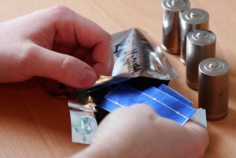 These simple, yet novel prototypes are made up of regular C-size NiMH rechargeable cells that are wrapped with flexible photovoltaic panels. Using some flat wires and a conductive silver pen, the designer made a connection from the solar panel to the battery on each that allows for a trickle charge. He has ideas to improve the design further too, like adding a charge-level gauge and capacitors for more efficient charging, but they would be difficult to implement without increasing the battery’s size.
