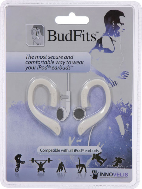 If you’re an active sort who likes listening to music while you work out, or you’re like me and have trouble keeping those damn iPod earphones in your ears, then you might be interested in this clever gadget by Innovelis. Called BudFits, they are simple, lightweight frames that easily clip-on to your standard iPod buds and wrap around your ears like, well, wrap-around earphones.